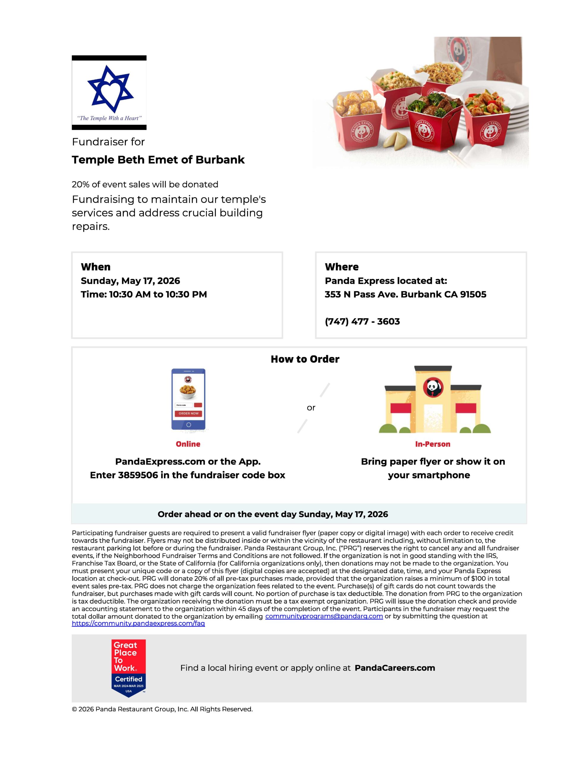Click flyer to download or use Fundraiser Code 3859506 in the PandaExpress App